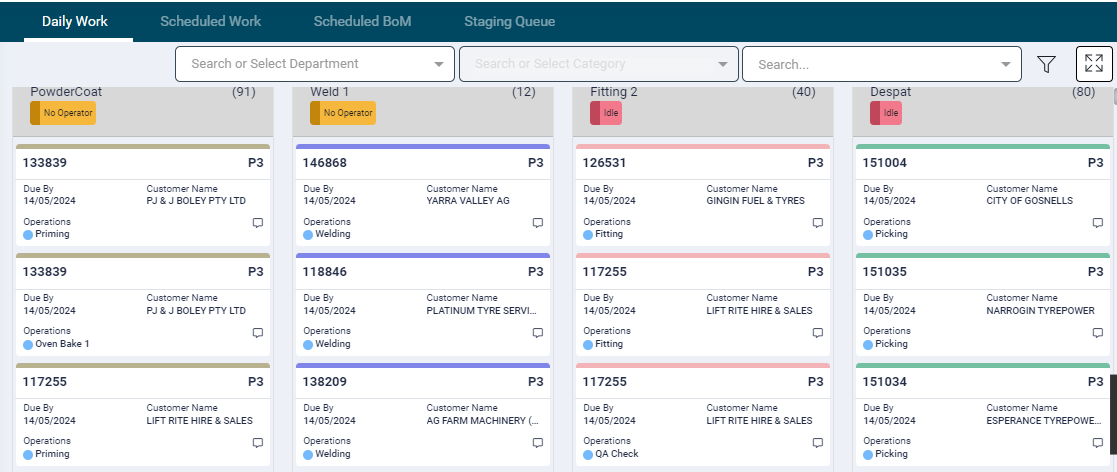 - The cards will be displayed in the order of their status starting with In progress, then paused, then missed schedule and then scheduled operation. These will be sorted by priority with P1 being the highest and changing colour to a black tile on the Daily work screen.
