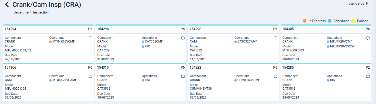 - The next row lists all the jobs in progress. The card would display the job code, component name, operation, status (In Progress, Scheduled, Paused, Missed Schedule) and the due date.