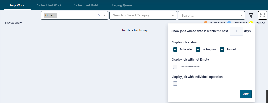 - The first field displays data based on job due date. By Default, the data for all jobs whose due date is less than current date + 1 day is displayed. This field can be extended to 14 days
