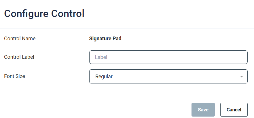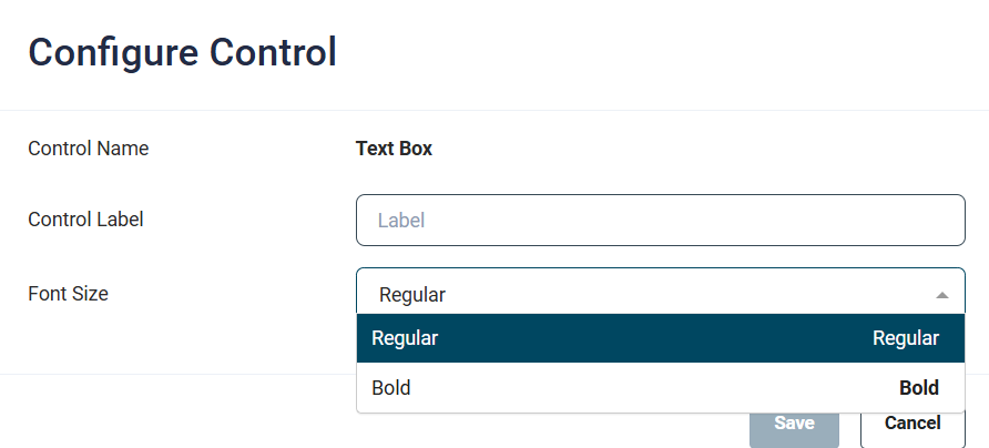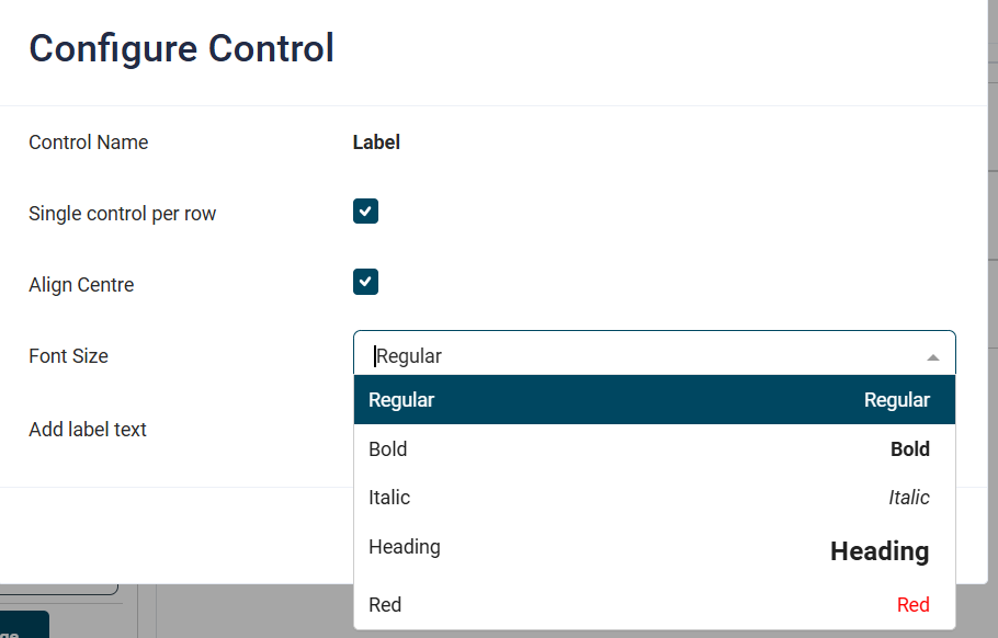 - Label: A label acts as a heading or title text that can be used to display information to the operator. The Label can be restricted to only show one control per row and can be aligned to the center. The Font style can also be changed before adding text