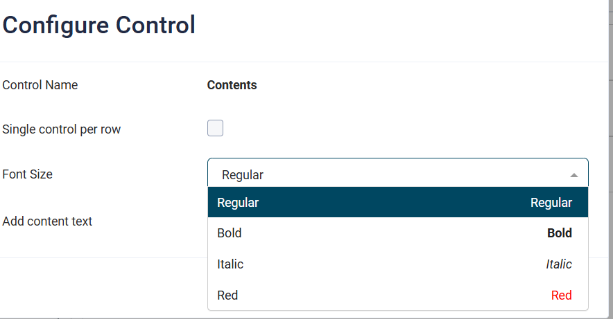 - Content: Allows users to enter a more detailed information section that typically acts as a prompt or instructions to the operator filling out the form. Font Style of the text can be changed as well as the option to make it the single control and aligned to center.