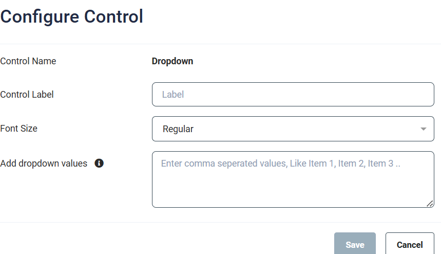 - Drop Down Selection: The Drop-down selection lets users enter drop down options that operators can select when filling out the form. Drop down values will need to be separated by commas and a label can be added to give more direction about the drop down function to operators when filling in the form.