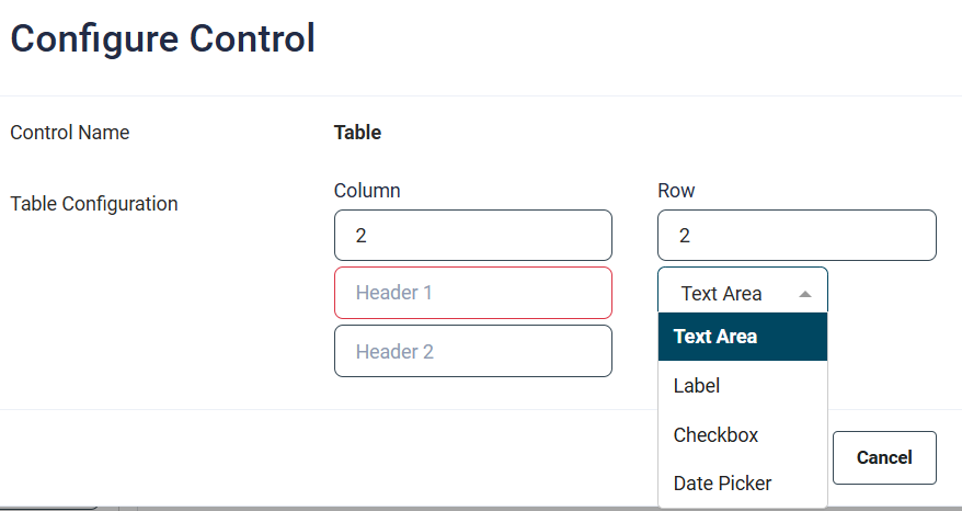 - Table Insert: The table insert allows users to separate information in the form. The table will allow you to select different functions specifically for the columns. You can have 7 columns and up to 50 rows with each column able to have its own function. The header will be the title row for each column.