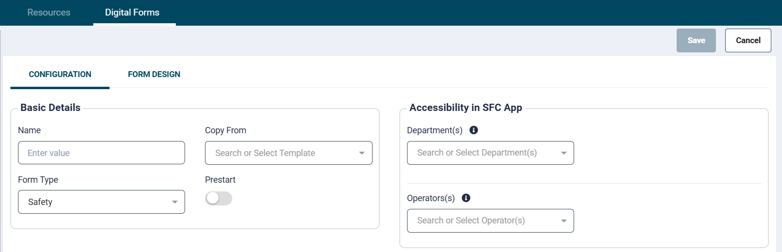- Safety: This is saved against the operator and typically used as a safety acknowledgment pre-start form. This will appear once the operator logs into the Shop Floor Control app if it is set up as a Prestart. If the Prestart is not toggled with a Safety Form Type then operators will have to navigate to the Forms section in the Tablet app to fill in the form