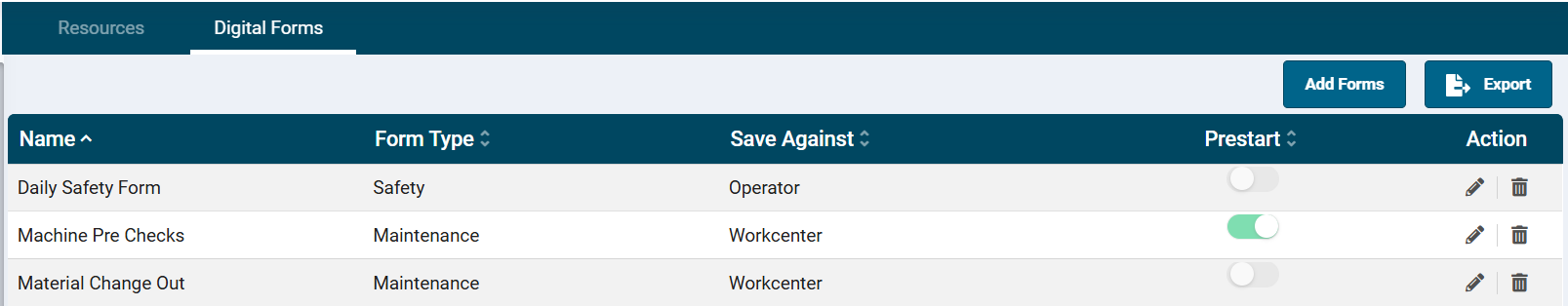 - Maintenance: This is saved against the machine/WorkCentre and is typically used as a maintenance record form. This can again be configured as a Prestart which will appear on signing into the allocated Work Centre which will be configurable on the right under Accessibility in SFC App