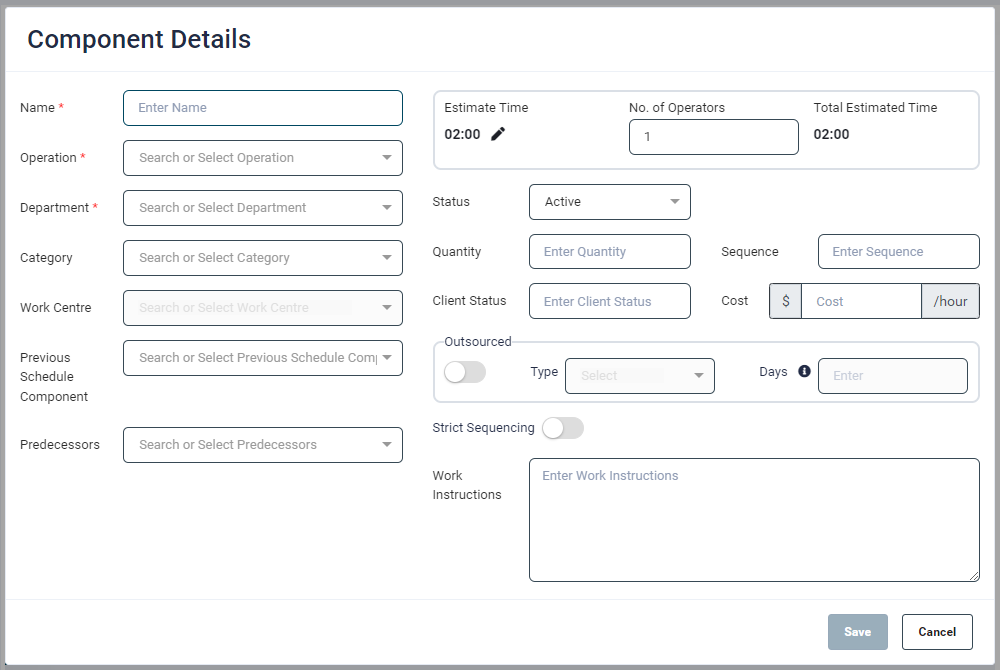 - A pop-up window will open for adding all the component details. For more information please refere to the Component Details section.