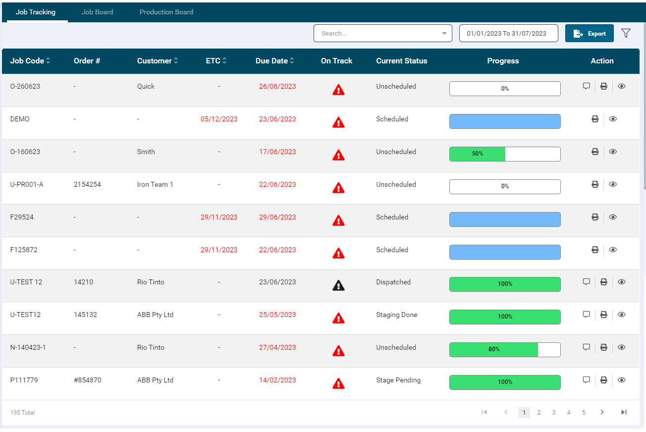 - The listing page displays job and component level progress with the option to customise what columns you want to view in the Job Tracking page by clicking on the cog on the top right hand side.