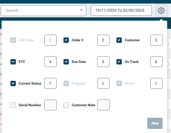 - This settings window will allow you to pick up to nine display columns for the job tracking page and allows you to customise what order you want to display the columns. Any Custom Job Field items can be displayed here if they are enabled for Display on UI (More information available under Job Configuration -> Custom Job Fields)