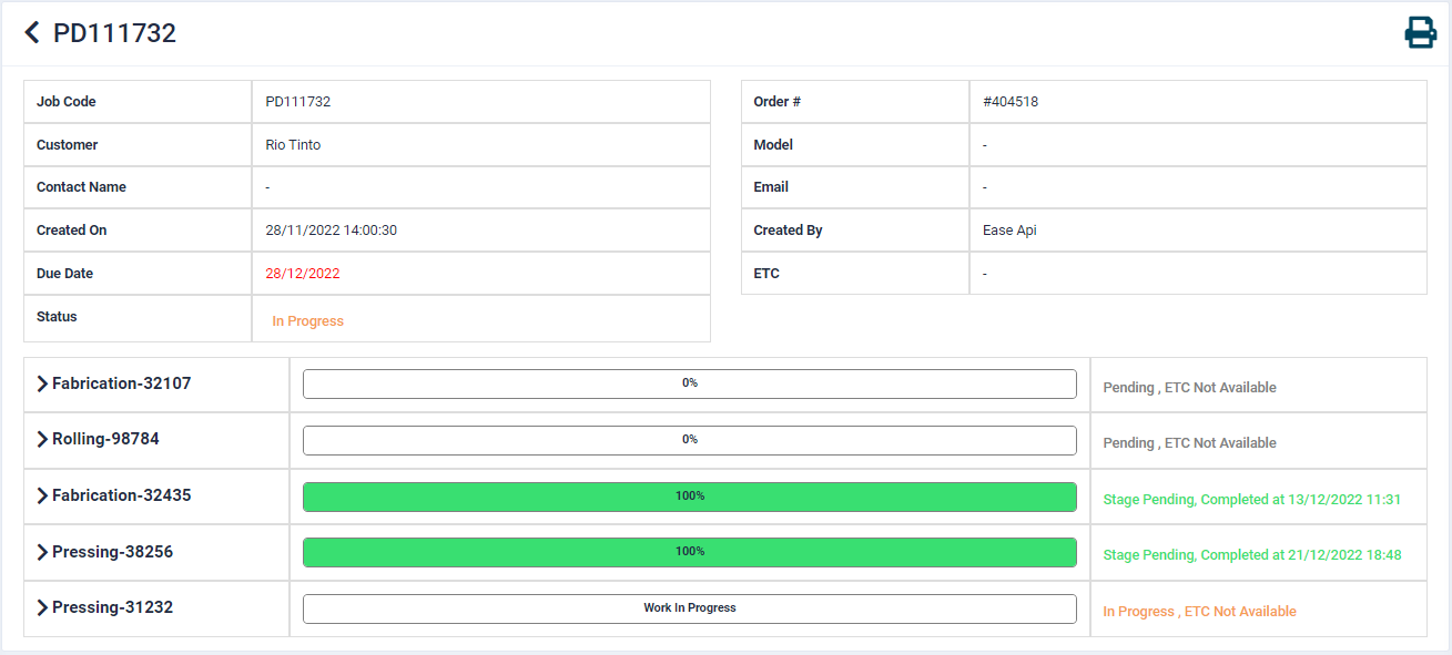 - Clicking on the arrow in front of the component names will expand the row and display the assigned work centre(s) in case of multiple operations, the job progress bar, job status and date stamp.