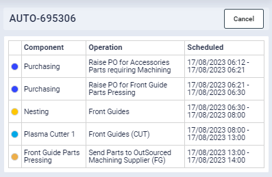The section presents a list of all the jobs categorised by department along with their respective components, operations and schedule dates.