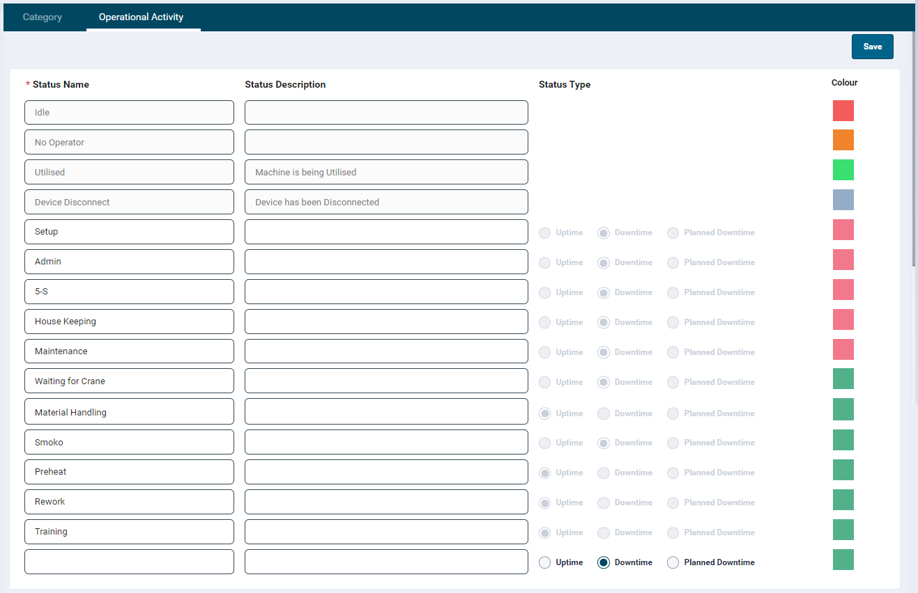 These operational statuses will have an effect on the Utilisation and OEE calculation. Any status being configured with “Planned Downtime” would be considered as Downtime.