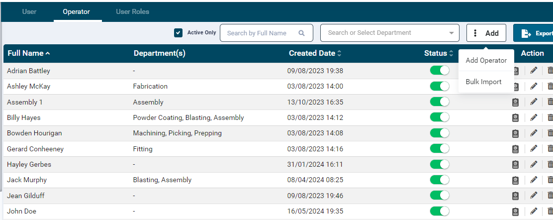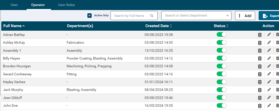 - Created Date: This column displays Operator's created date.