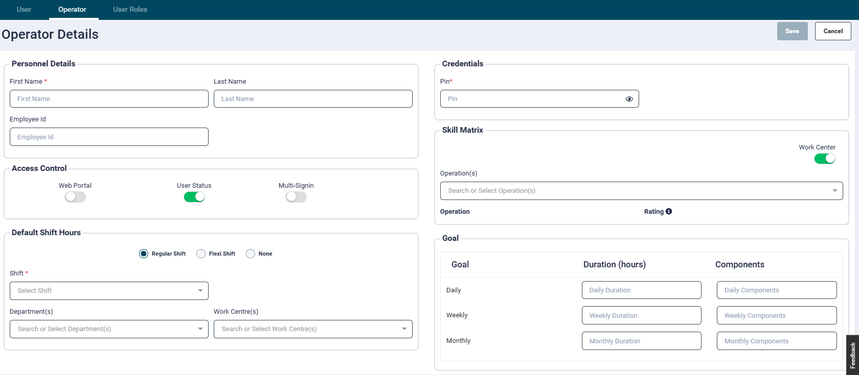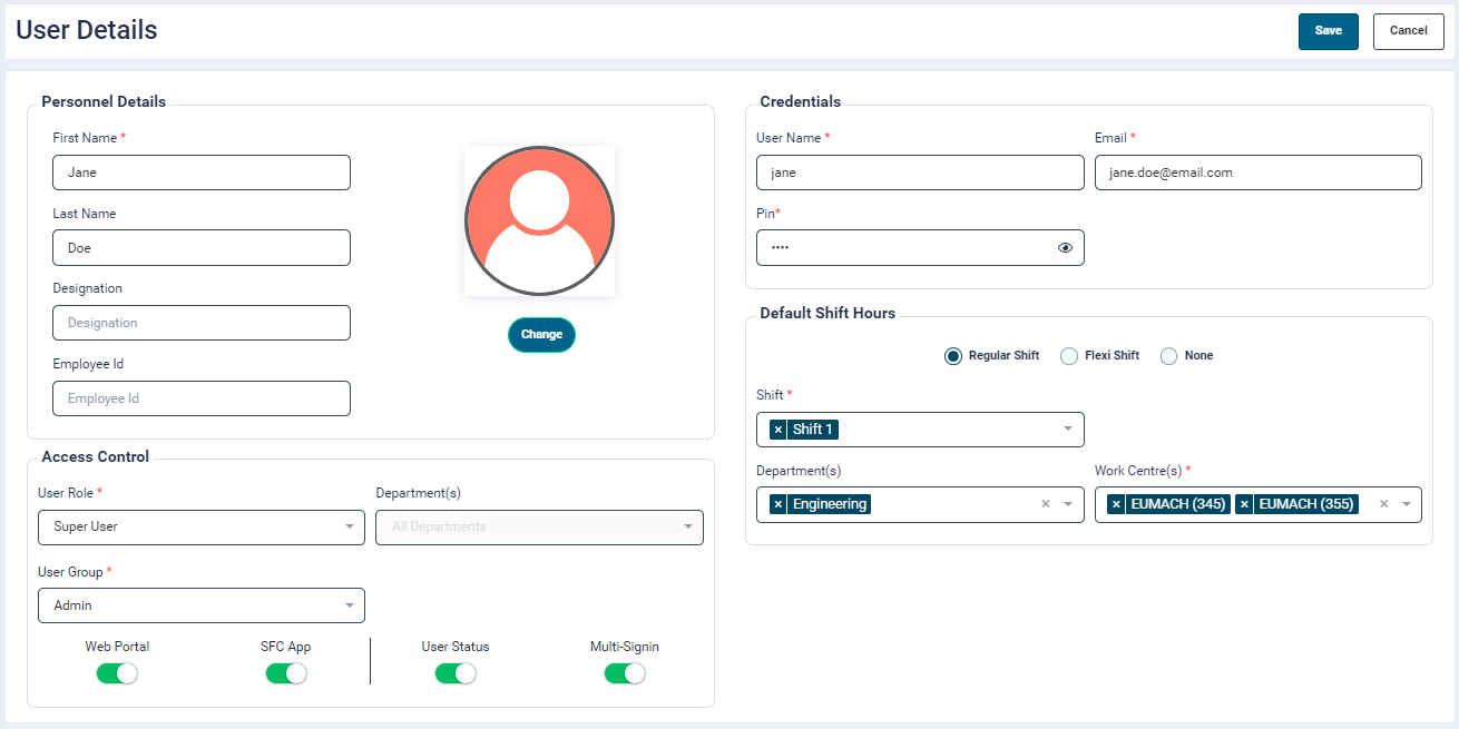 - Pin: Enter a unique 4-digit PIN number for the Shop FLoor Control tablet app (mandatory field)