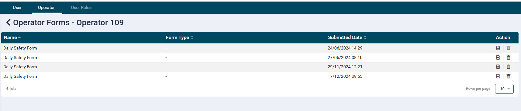 - Here you will be able to see any safety or user/operator level forms that have been successfully submitted by the Operator.