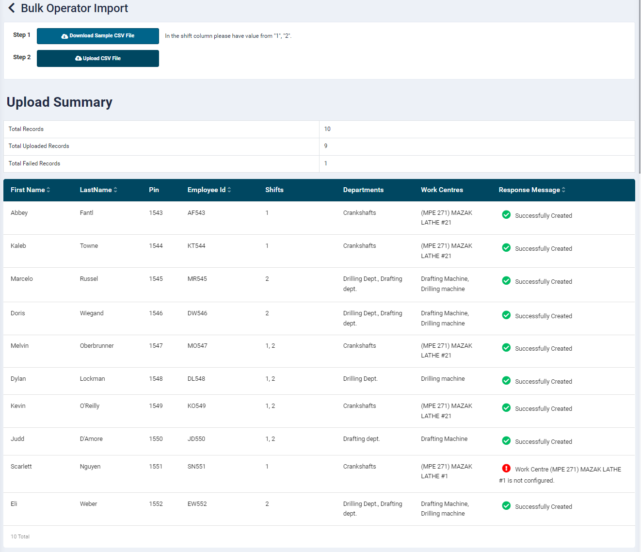 - Work Centres: Enter the work centres assigned to the operator. Please ensure that the work centres belong to the departments entered in the Department column. Multiple work centres separated by comma can be entered.(non-mandatory field).