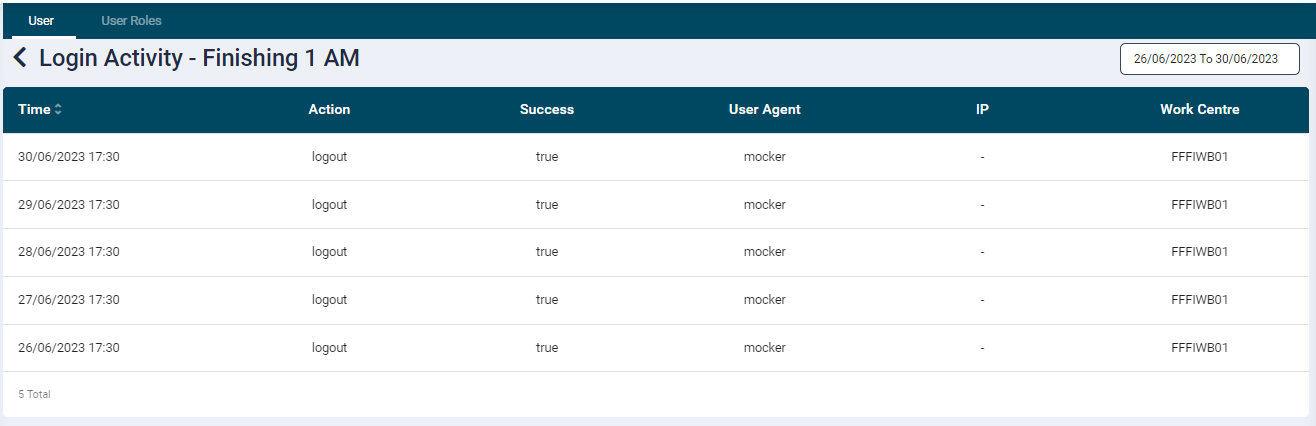 On the listing screen the Login Activity button under the Action column provides access to the operator's login activity on the Shop Floor Control tablet app.