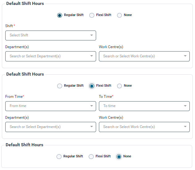 - There are three options available: Regular Shift, Flexi Shift and None.
