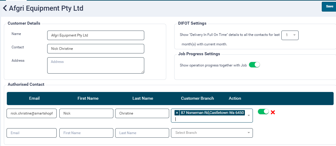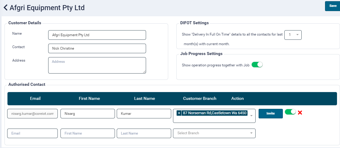 - Edit: Clicking the Edit button will display a page where the user can provide Customer Details, Authorised Contact and DIFOT Settings.