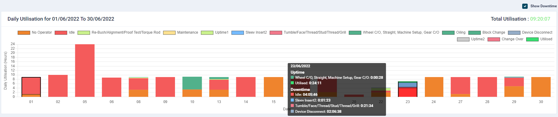 - The user has the option to view downtime hours of a machine by clicking the Show Downtime check box.