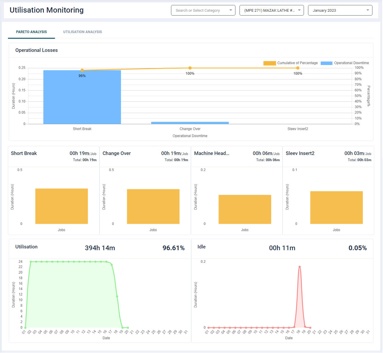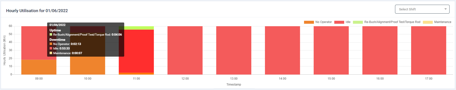 - This chart provides an hourly break up for the machine utilisation bar selected in the Utilisation chart.