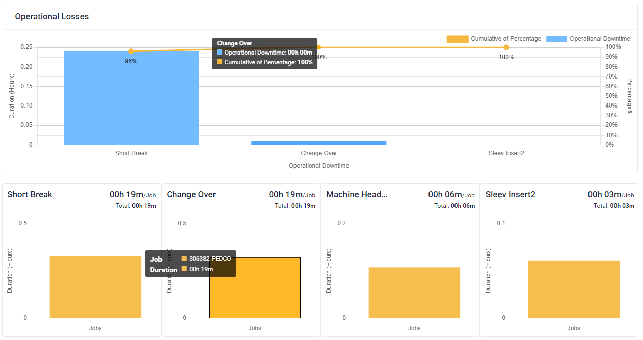 - On click, all the bar charts will display downtime (for business hours) in each machine status for the selected time duration.