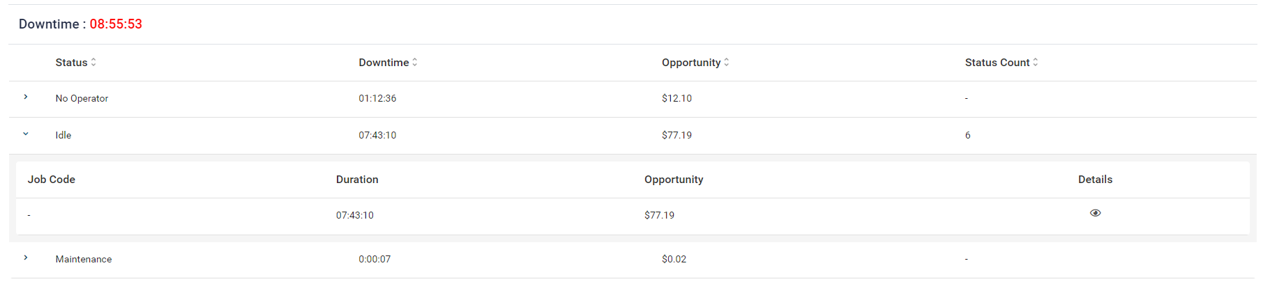 - Clicking on the Expand icon against each downtime status provides downtime details by Job Code, Duration, Opportunity (i.e. downtime cost to the company).
