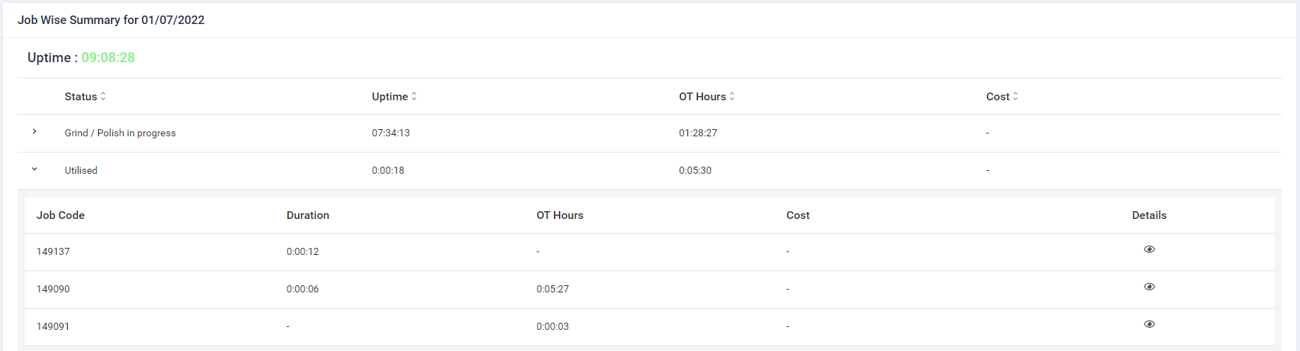 - Clicking on the Expand icon against each uptime status provides uptime details by Job Code, Duration, OT Hours and Cost